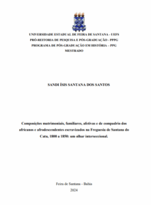Esta dissertação reflete acerca da escravização de africanos/as e afrodescendentes na Freguesia de Santana do Catu entre os anos de 1800 a 1850. A partir da interseccionalidade discute e compreende as composições matrimoniais, familiares, afetivas e de compadrio engendradas por africanos e afrodescendentes como formas de resistências e redes de sobrevivência e solidariedade. Interpreta a função e a relevância da mulher para a consolidação e perpetuação da escravização e faz uso das categorias de Gênero, Raça e Classe para compreender os indivíduos escravizados e investiga como a construção cultural de gênero, raça, classe e condição social favoreceram as relações de poder moldadas naquela sociedade escravista. Notadamente, evidencia homens e mulheres africanos como indivíduos ativos de parte ou grande parte daquilo que poderia formar e/ou transformar seu meio social, familiar e afetivo. Para tanto, realizou-se o cruzamento de fontes variadas, como os registros de batismos, matrimônios e óbitos. Atrelado à História Social da Escravidão, este estudo centra-se no método da ligação nominativa, dessa maneira, a criação de um banco de dados tornou possível a análise do perfil demográfico dos/das protagonistas deste estudo bem como suas composições familiares. Dessa maneira, esta pesquisa mostra aspectos das composições matrimoniais, familiares, afetivas e de compadrio dos africanos e afrodescendentes numa região pouco estudada para a primeira metade do século XIX.